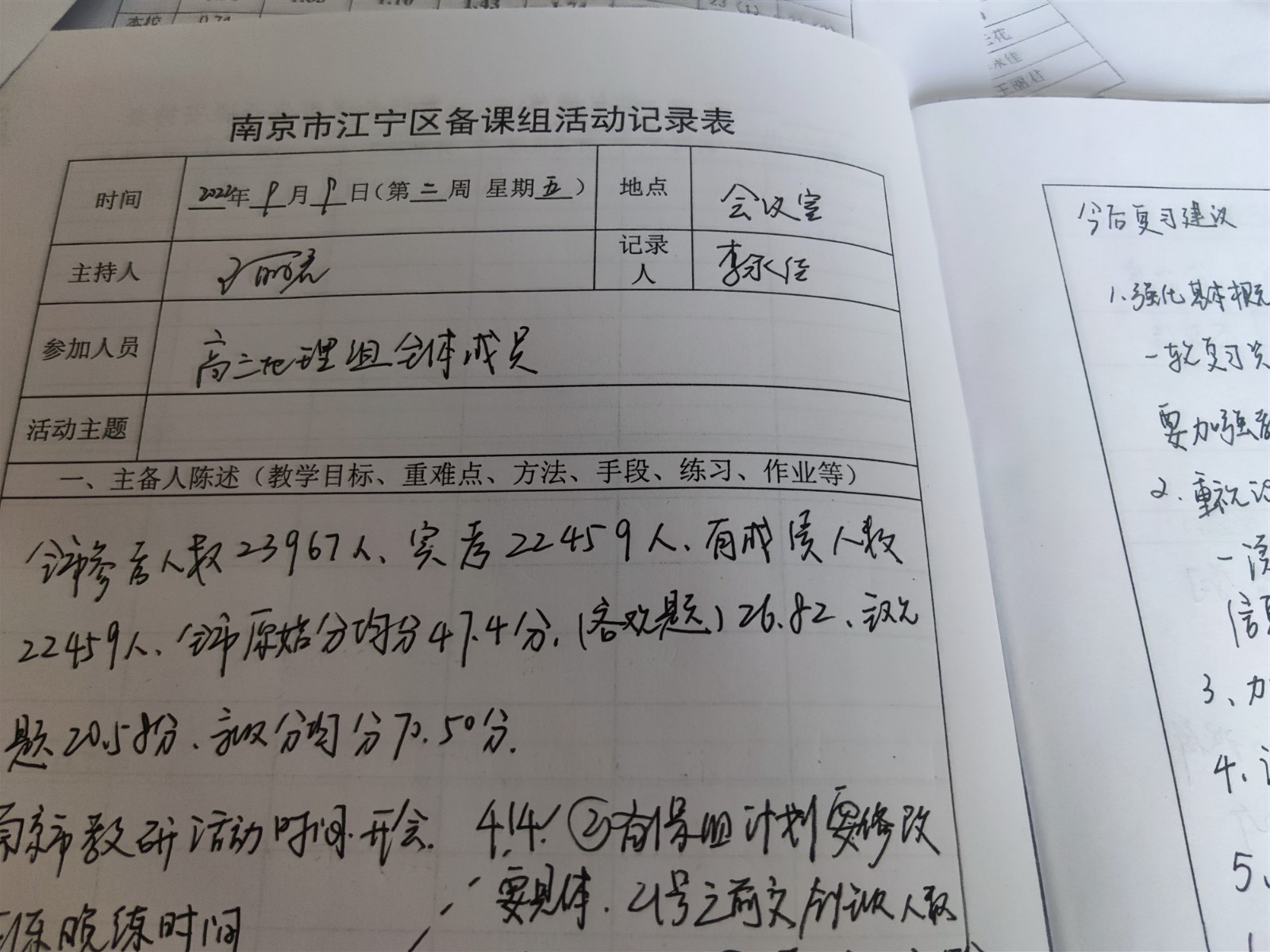 2022年9月9日,秦淮中学高三地理备课组开展了一次教研活动,活动主题:《南京市期初考试分析》一轮复习集体备课,王丽君老师主持,李永佳老师记录,地理组全体成员参与了研讨。