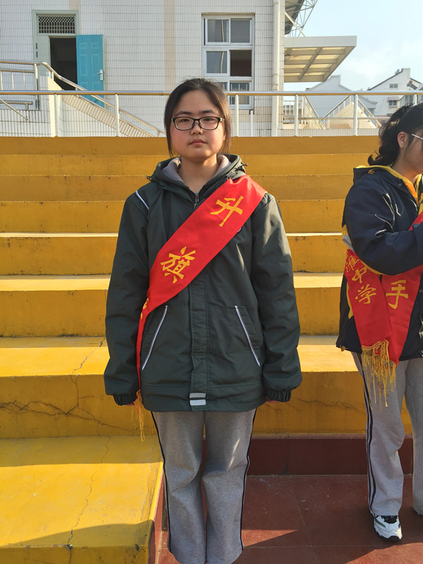 升旗手:担任升旗手的是高一(3)班的迟婷同学,迟婷同学是高一(3)班的纪律委。她勤奋刻苦,在学习的过程中,铭记“never say give up!”平日里的她也能与班级同学友好相处,总会在同学遇到困难时伸出援助之手。在班级的工作上她认真负责,有较强的领导力,每次都能出色地完成老师布置的任务。希望她在今后的学习中披荆斩棘,争取在每次考试中都能取得优异的成绩。班主任是陈贤友老师。