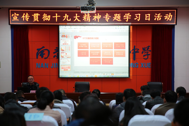2017年12月6日下午,学校党总支组织全体党员在阶梯教室开展“宣传贯彻十九大精神专题学习日”第五期活动,本次活动的主要内容是邀请区委党校张永军博士为全体党员做了题为《奋力开创中国特色社会主义美好未来》的专题辅导报告,张博士结合自己的学习体会以及工作生活经历,为全体党员阐释了十九大报告的精髓要义,学校党总支号召全体党员在学习贯彻十九大精神的过程中,既要“扑下身子踏实学”,更要“撸起袖子加油干”,努力在学懂弄通做实上下功夫,为江宁教育的发展和学校的发展贡献智慧和力量。
